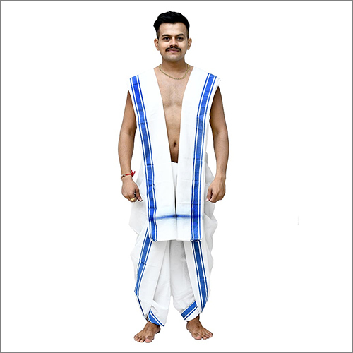 Explore in english - Mens Blue Border Dhoti Dupatta