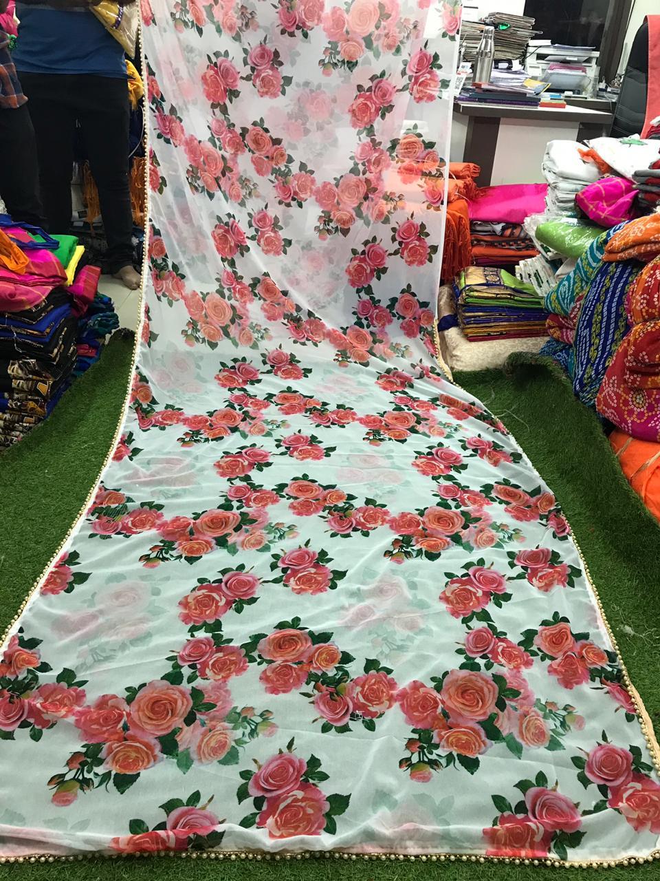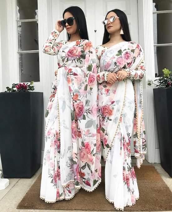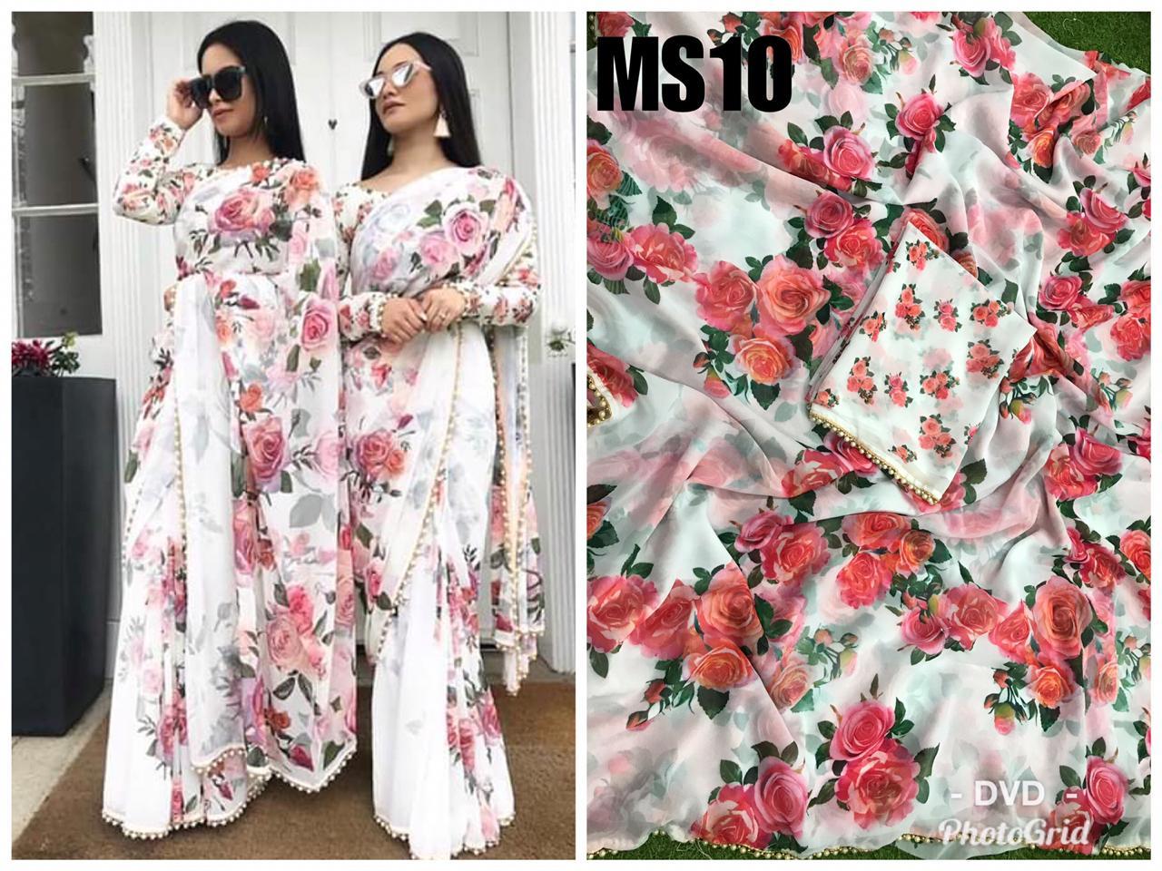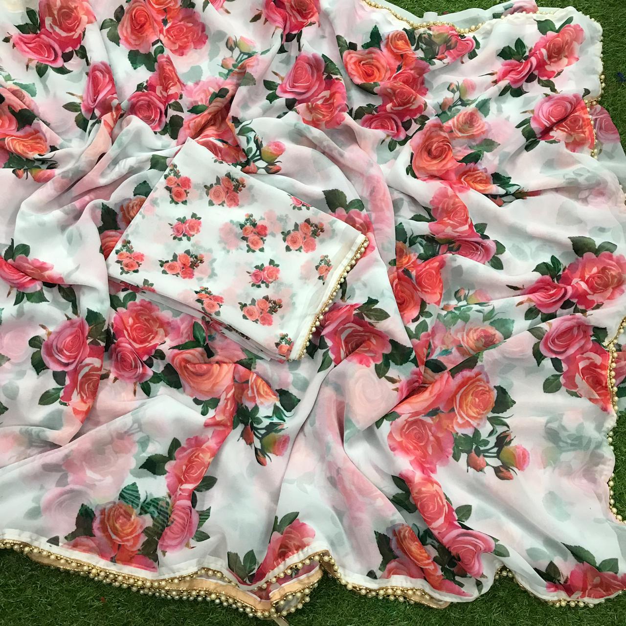 जॉर्जेट व्हाइट रोज़ प्रिंटेड साड़ी