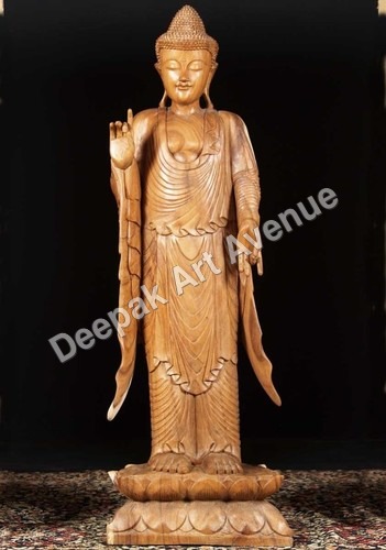 लकड़ी की खड़ी बुद्ध की मूर्ति