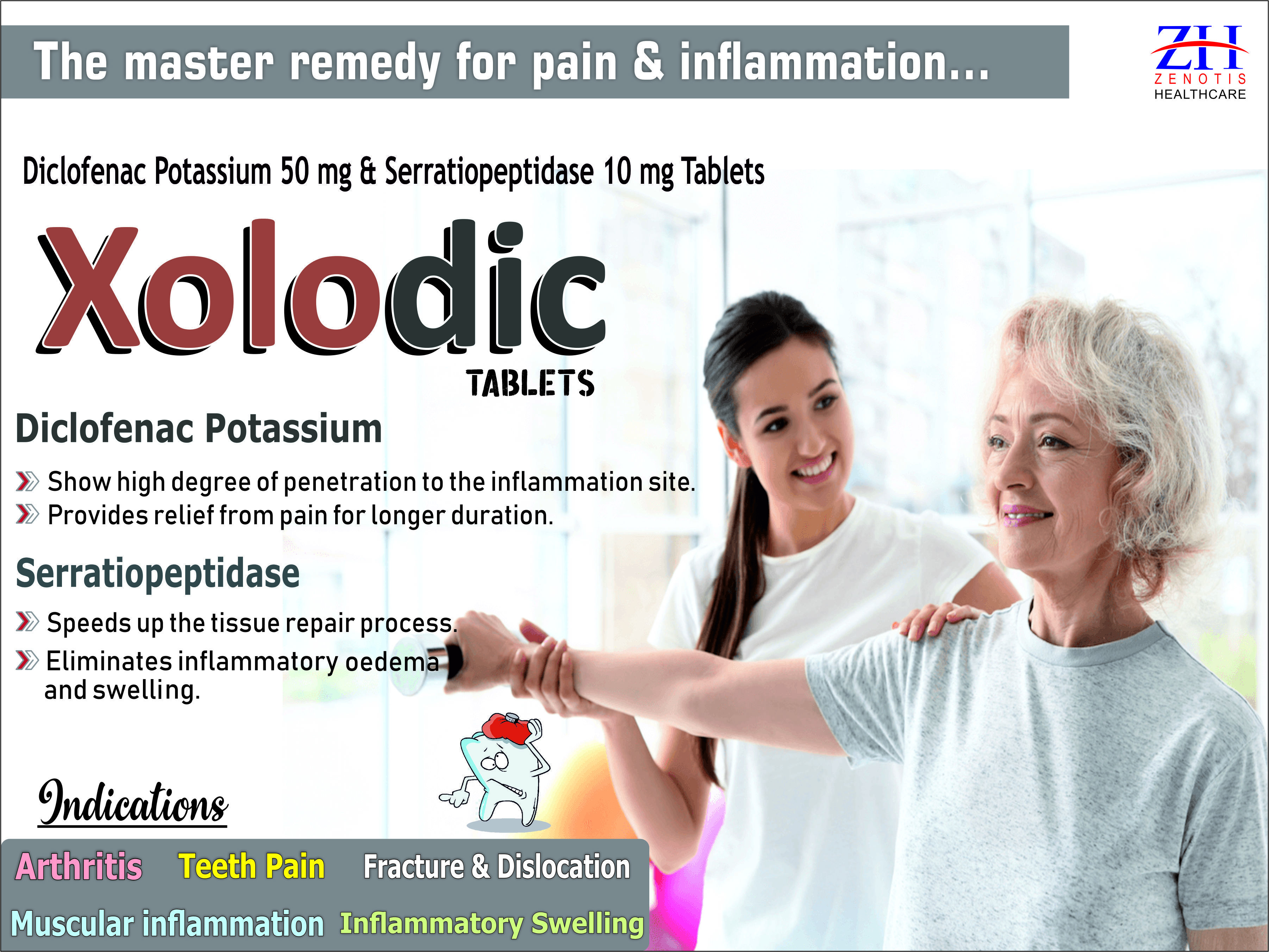 डिक्लोफेनाक और सेरासियोपेप्टिडेज़ टैबलेट के लिए अनुशंसित: हड्डियों और जोड़ों का दर्द