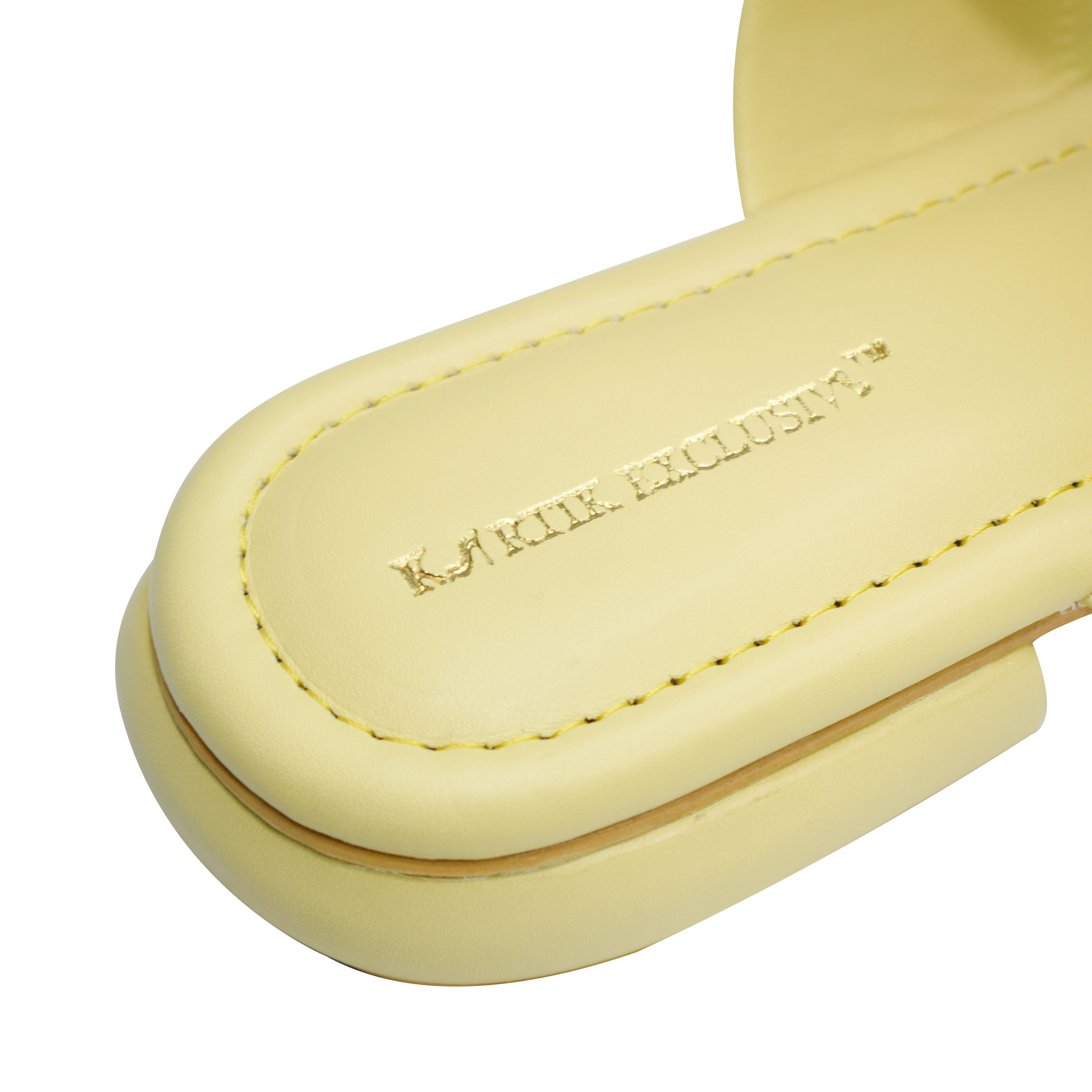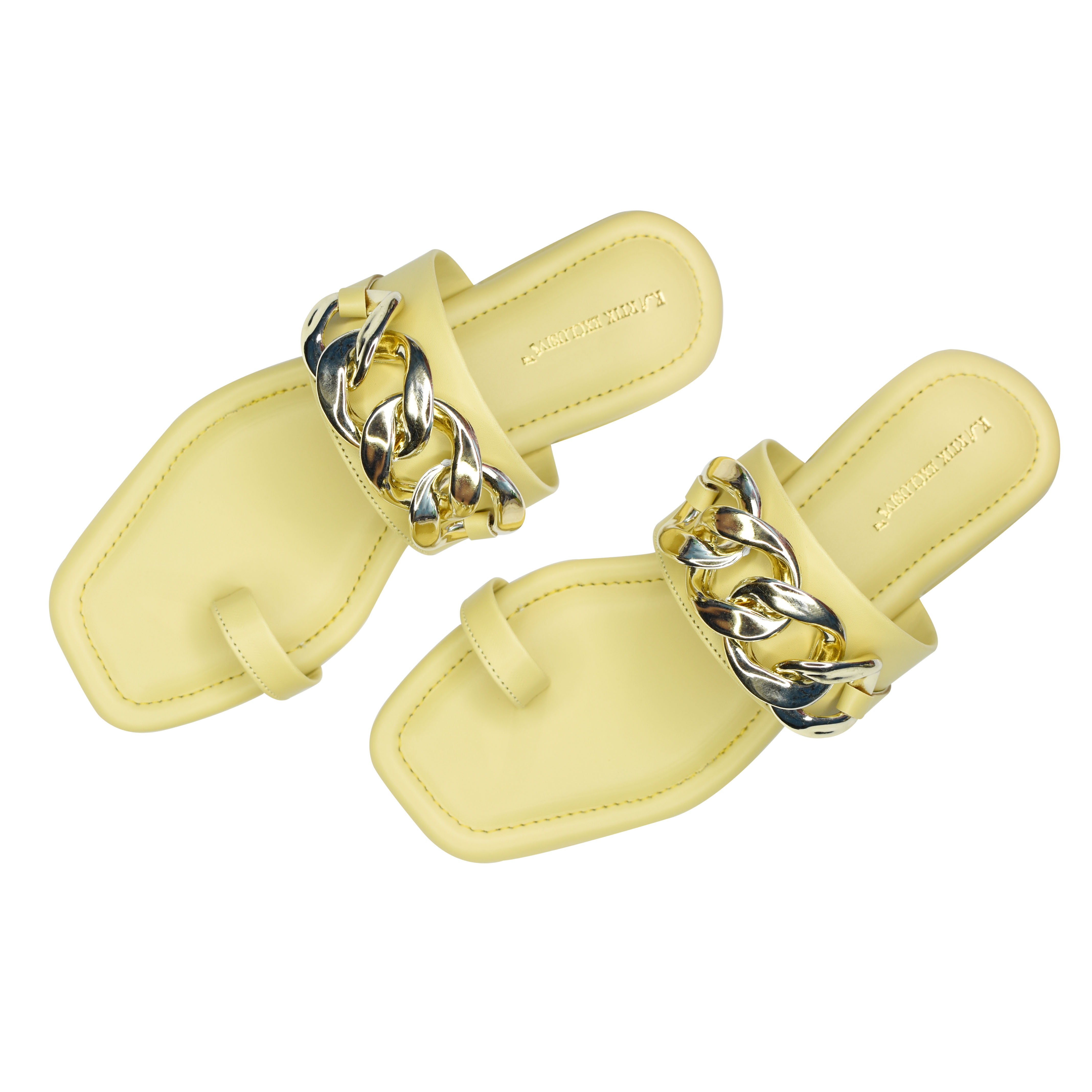 लेदर येलो कलर गोल्डन चेन थंब फ्लैट्स सैंडल