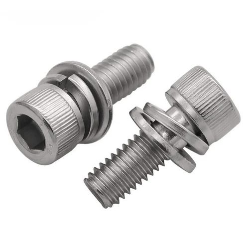 Allen Socket Head Cap Screw With Attached Plain And Spring Washer - Stainless Steel, M3 - M6, Silver , Round Head Design, High Strength Fastener