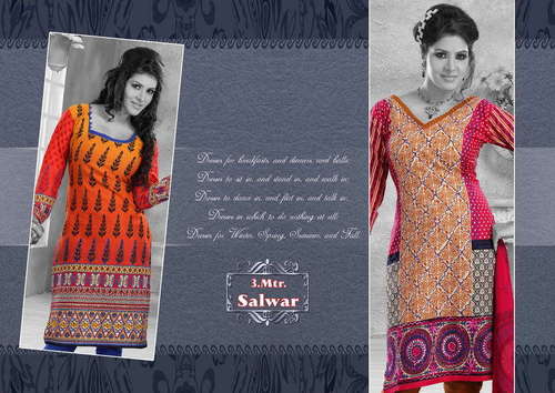 Pacing up with the current clothing trends, we, Asha Enterprise, are offering a superlative range of Apparel like Unstitch Suit, Unstitch Suit Material, etc. We are acknowledged as a leading manufacturer, exporter, supplier and trader in our functional domain. Our garments are aesthetically appealing, beautifully designs, made out of quality fabric and are available in variety of designs and patterns. Further, to meet the specific requirements of the customers, we also provide tailor-make option, where customers can opt for her personal choice of design, fab