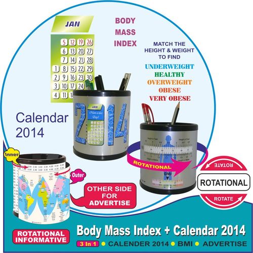 | Features | Desk calendar, BMI calculator, Pen holder, Rotational design, Customizable, Informative, Compact, Useful |
