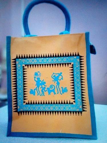 Designer Jute Bag - Jute Material, Hand Length Handle | Custom Design, Sky Blue And Brown Color