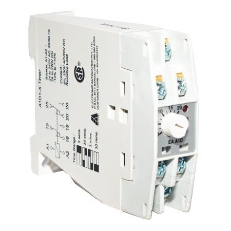 A1d1-x On Delay Timer - 240v Ac, 22.5 Mm(w) X 75 Mm(h) X 102 Mm(d), Time Selection 0.3secs To 30mins, 2 C/o Relays