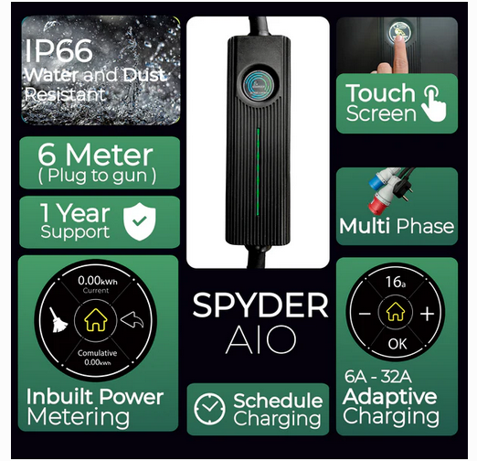 Electric Charger Spyder Aio - Heavy Duty Cable, Led Display, 220-240v | Fast Charging, Overload Protection, Compact Design