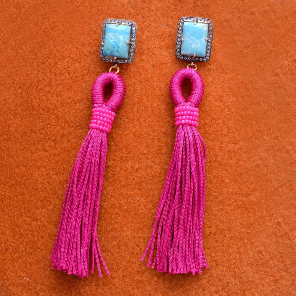 Gemstone Topaz Thread Earring Pair In 925 Sterling Silver - 3.2 Inch, Various Sliced Free Shape Stones, 18k Gold Plating, High Finish Polish