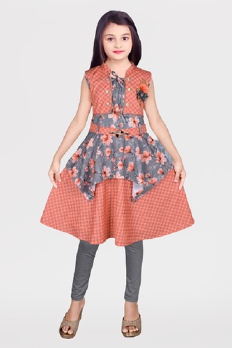 Appealing Look Orange And Grey Sleeveless Printed Cotton Girls Frock With Legging - Cotton Blend, Sizes S/m/l/xl, Bright Orange & Grey Colors | Breathable, Washable, Modern Style