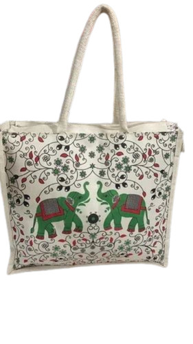 Printed Cotton Carry Bag - Cotton Fabric, Customized Size, White, Zipper Closure, Handled