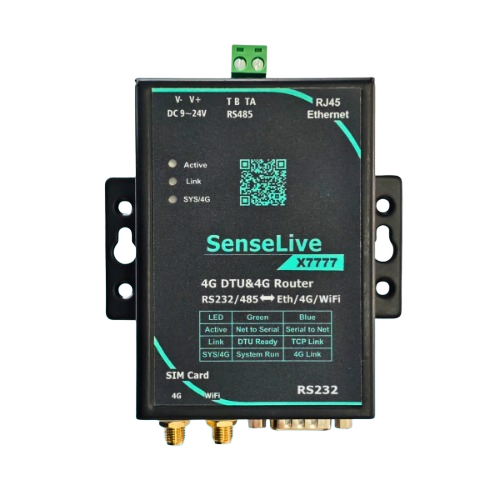 The SenseLive X7777 is a compact, industrial-grade multi-interface IoT gateway designed for seamless serial-to-network communication. It supports 4G (regional variants), WiFi, Ethernet, and RS232/RS485, making it suitable for a wide range of industrial automation and IoT deployments. With support for protocol conversion including TCP-Serial, Modbus RTU-TCP, MQTT, and RS485-to-JSON, the X7777 enables efficient data acquisition and ensures reliable connectivity to cloud platforms.