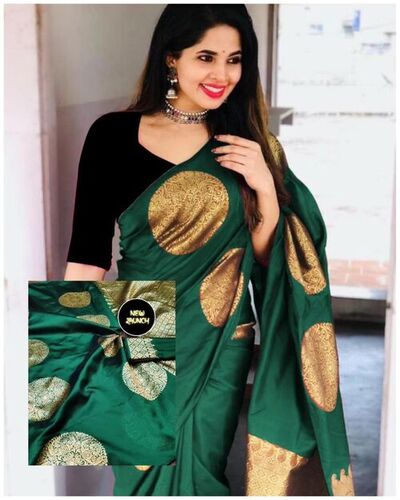 Soft Lichi Silk Saree - Soft Lichi Silk Fabric, Opaque, Green Color With Polka Dots , Traditional Party Wear With Zari Work Embellishments And Beautiful Jacquard Pallu