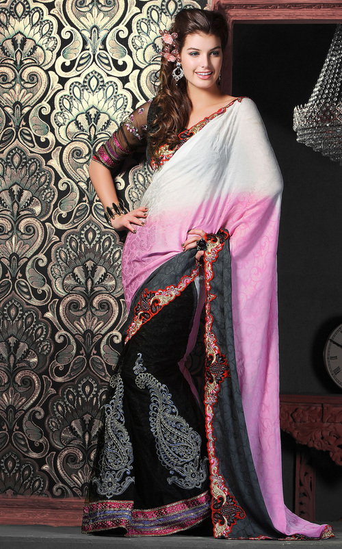 We are instrumental in trading a qualitative range of Designer Sarees including Pink Net Saree with Blouse, Black and Purple Bemberg Faux Georgette Saree, Deep Blue and Yellow Velvet and Faux Crepe Saree etc.